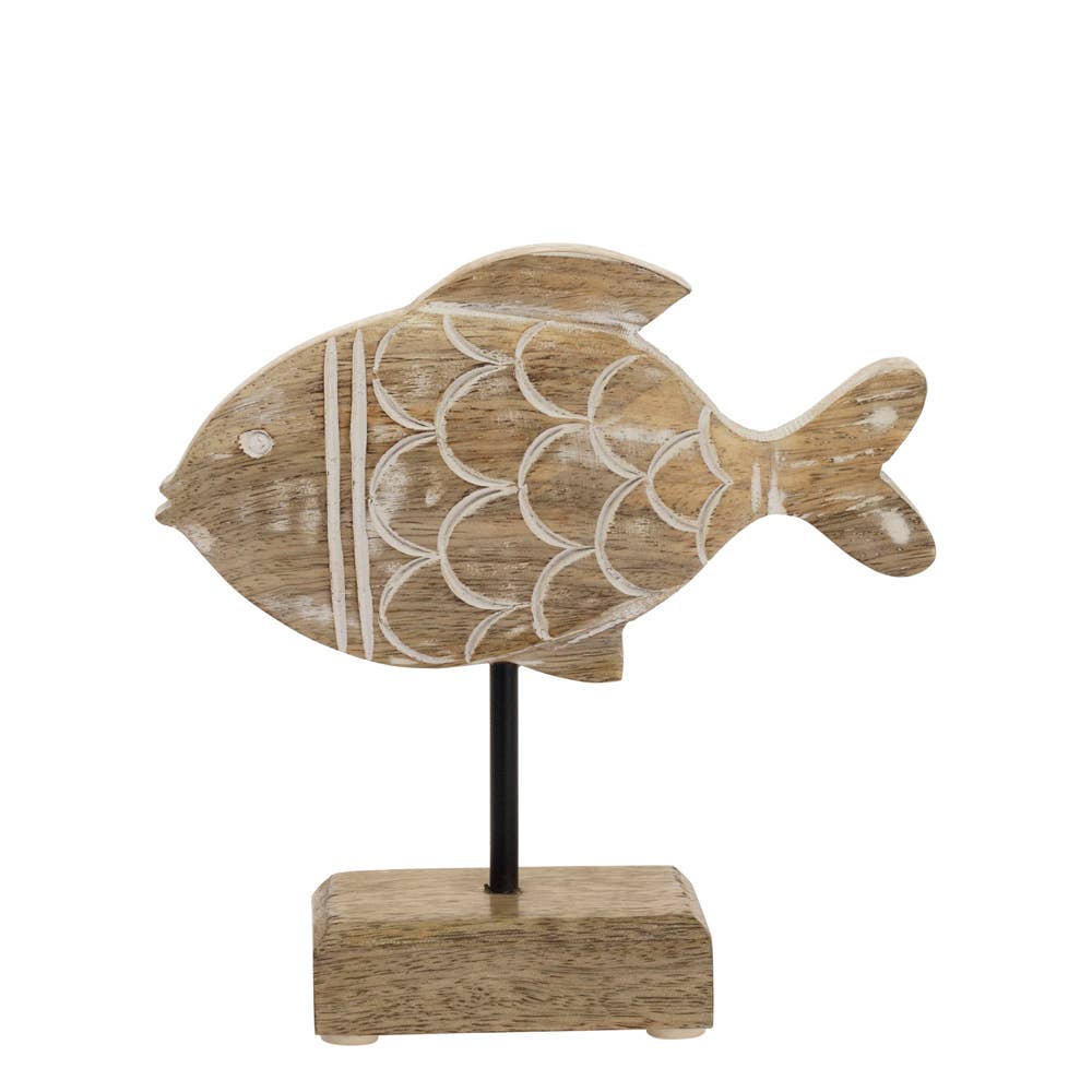 Natural wood tones, white Coastal decor, this charming wood fish on a stand radiates a soothing, beach-inspired vibe. It's a perfect accent piece to liven up any room with a touch of the ocean's tranquility.