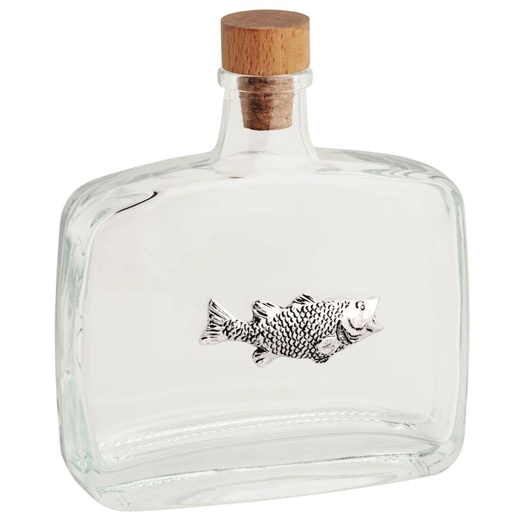 Glass decanter features cast aluminum icon exterior and cork stopper with wooden top.